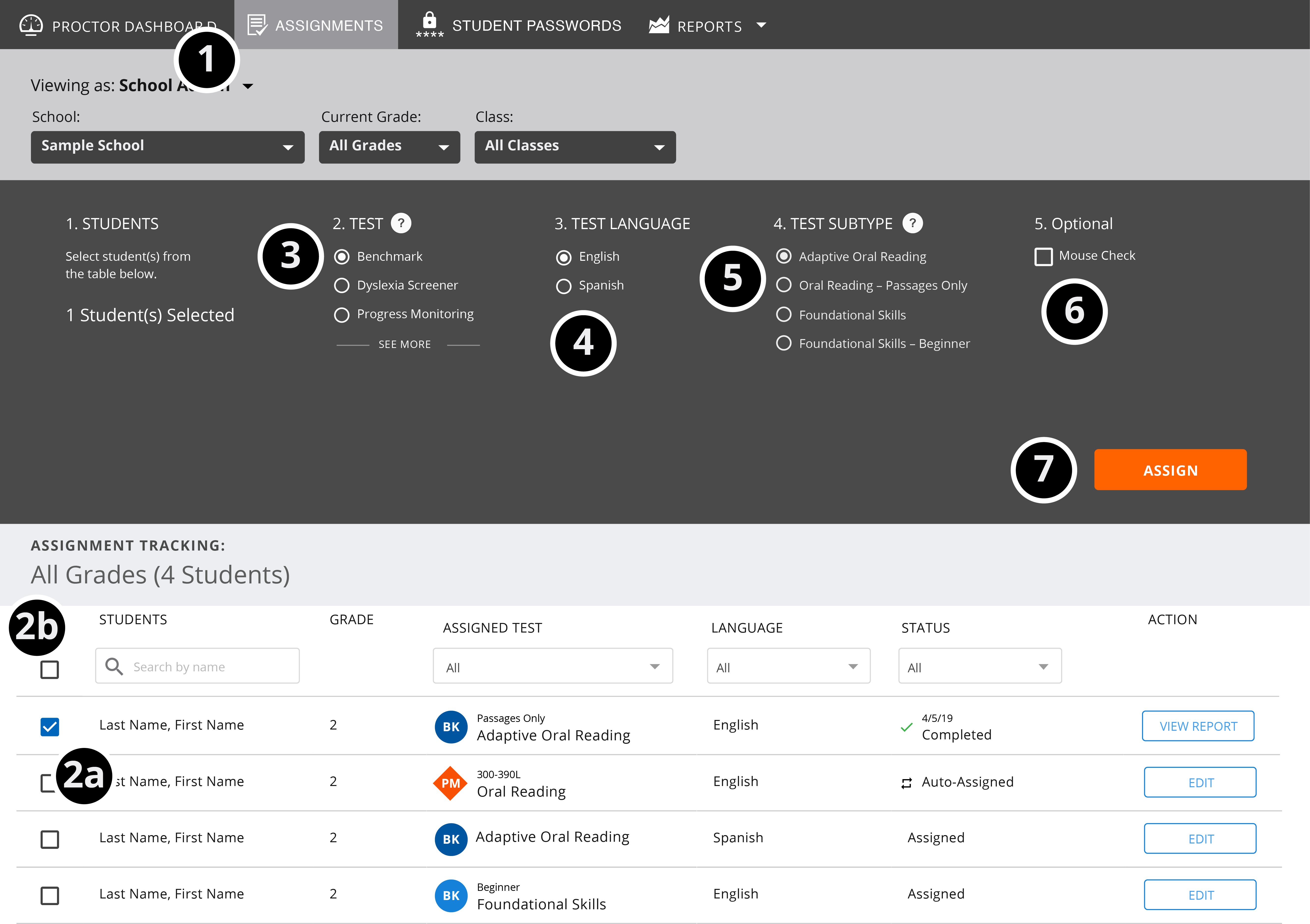 6. Note: Adaptive Oral Reading is assigned to all students by default. If you want to give this test to all your students and do not want to use the Mouse Check, you do not have to make any changes and are ready to begin testing.