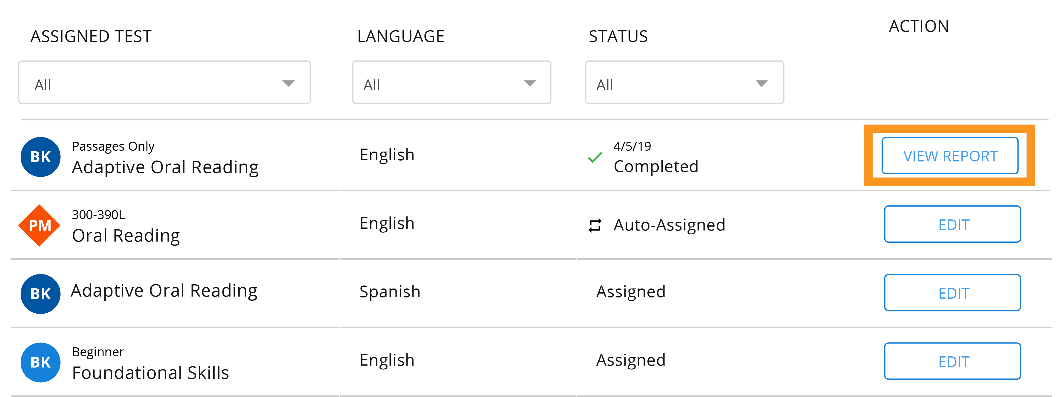 You can find results for completed tests by selecting View Report. This will take you to a student’s Individual Student Report.