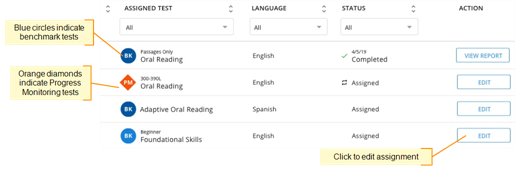 While any Benchmark test is assigned, you will not have access to the Edit button for the Progress Monitoring assignment. If you assign Progress Monitoring to a student while a Benchmark test is assigned, or if any changes are made to a Progress Monitoring assignment, the Benchmark test will be unassigned. You can reassign it if needed.