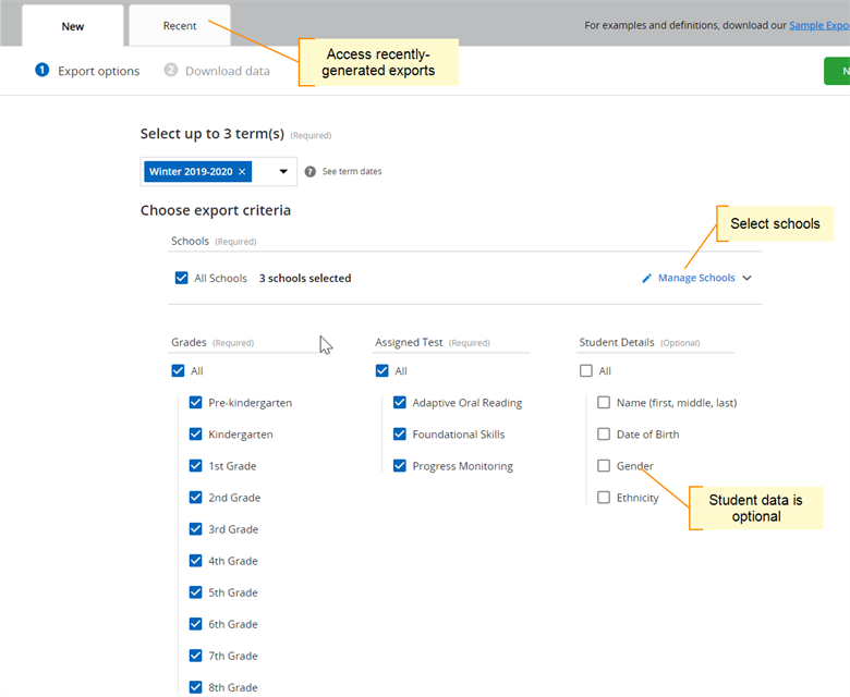 Choose your criteria and click Next. Student ID will always be included in the file; other student data is optional. You can then choose to save the spreadsheet as an Excel XLSX or CSV file. Once you've generated an export, it will be available for 14 days under the Recent tab.