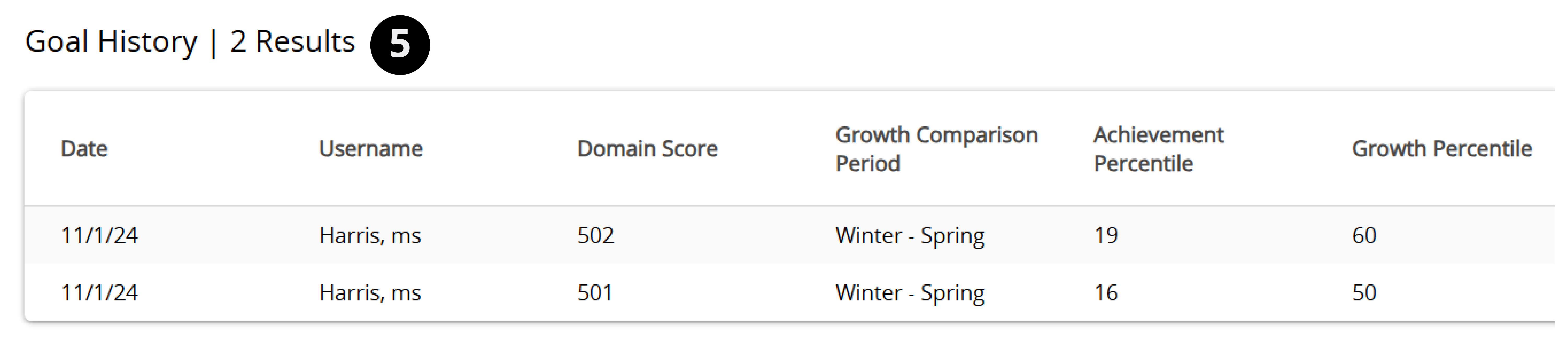 Note: The growth comparison period list is populated based on which terms have reportable Progress Monitoring data. If the start term has multiple data points, the goal will be based on the first domain score in the growth comparison period (the starting domain score).