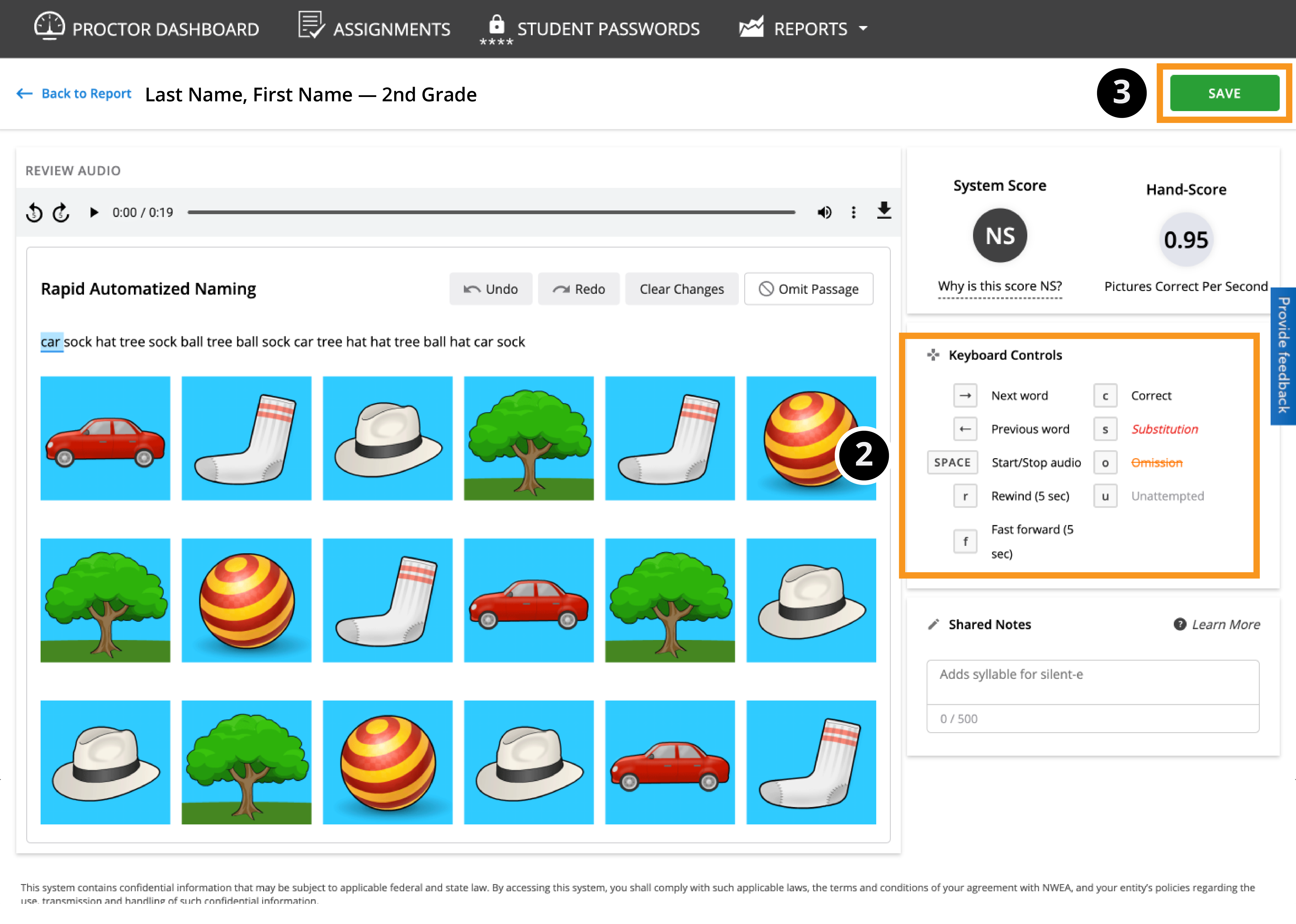 2. Use the Keyboard Controls to review and score the student's audio recording. For detailed instructions, refer to Keys and actions for hand scoring NWF.