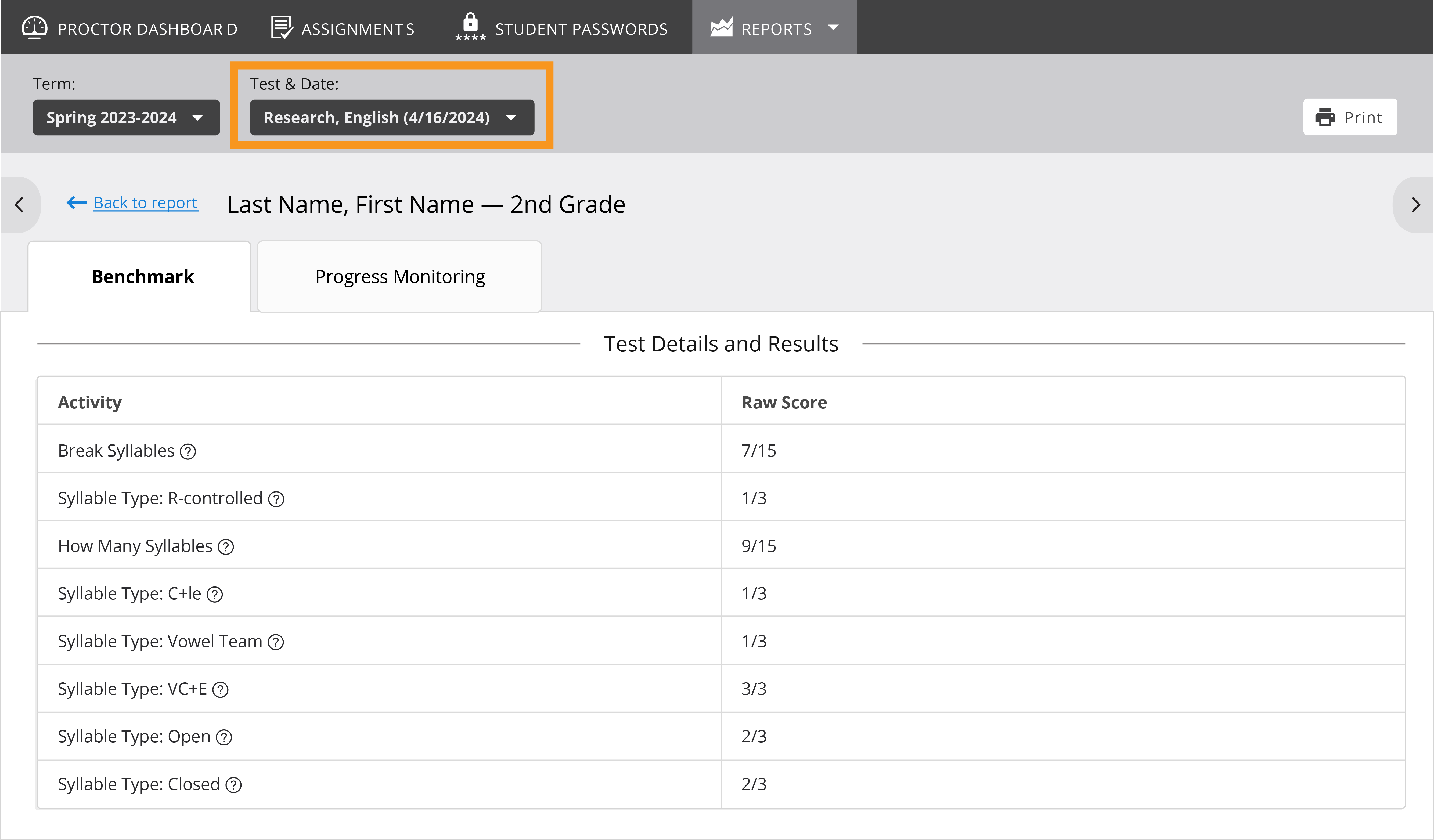 Instructors and School Administrators can hand score and review a student’s NWF performance, and evaluate a student's progress as needed.