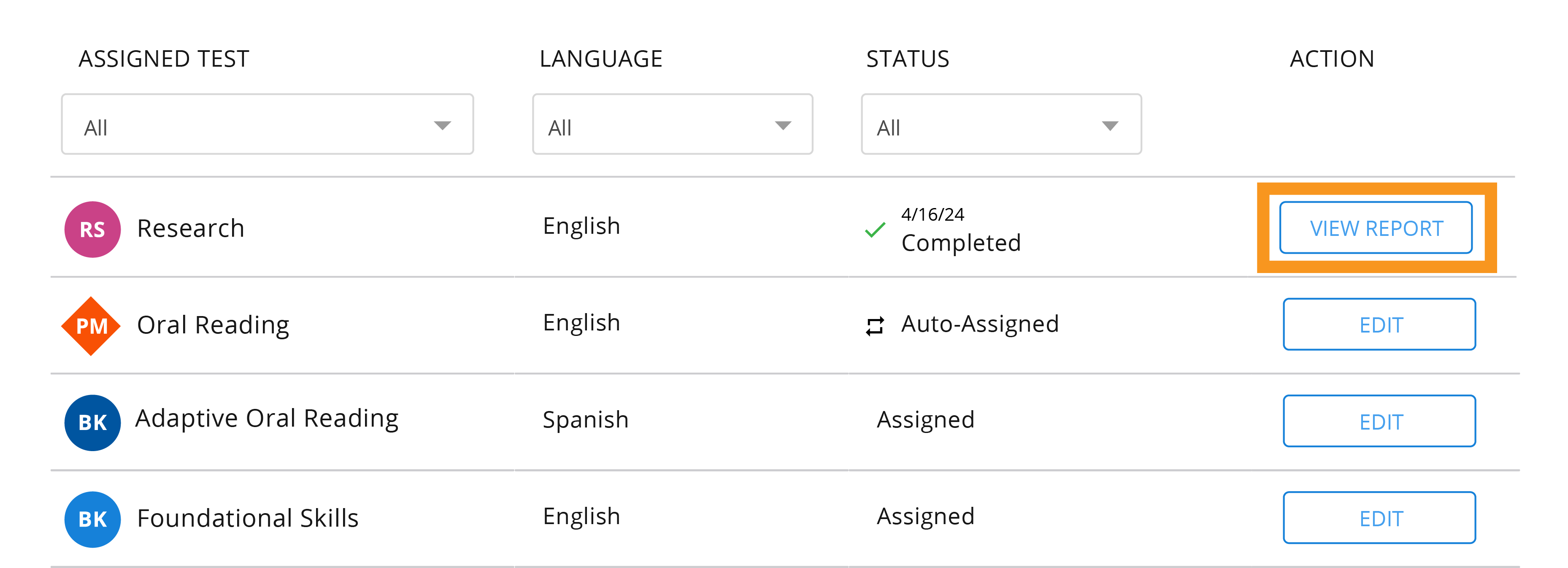 You can access these results on the Individual Student report from the Assignments page by selecting View Report after a research test is completed.